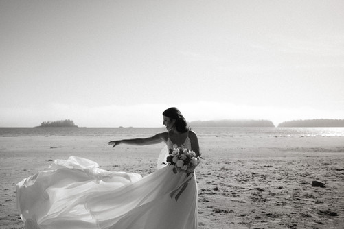 As we walked toward the beach, the sun climbed higher, bathing everything in a warm glow. Ivy wore a flowing white dress that danced elegantly with the wind, perfect for a tofino beach ceremony.