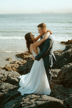 After getting some epic shots on the sunny white sand beach, we took to the rugged coastline which offered that classic west coast backdrop along with some much needed shade. As the sun danced across the sky, Ivy and Dylan climbed the rocks and got to connect even deeper with each other.